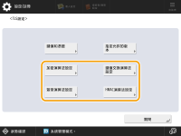 如果要使用自己產生的金鑰和憑證,請在產生金鑰和憑證前執行下列程序。產生網路通訊的金鑰和憑證 如果要使用從憑證授權單位 (CA) 取得的金鑰和憑證,請在執行下列程序前註冊金鑰和憑證。註冊金鑰和憑證 如果將 <以FIPS 140-2作為加密方法的格式> 設為 <開啟>,可以讓 TLS 通訊加密方法符合美國政府核准的 FIPS(聯邦資訊處理標準)140-2。<以FIPS 140-2作為加密方法的格式> 如果 <以FIPS 140-2作為加密方法的格式> 設為 <開啟>,則嘗試指定的 TLS 憑證使用未被 FIPS 認可的演算法(低於 RSA2048位元)時,將會發生錯誤。 如果將 <以FIPS 140-2作為加密方法的格式> 設為 <開啟>,並傳送至不支援 FIPS 認可加密演算法的遠端方,將會發生通訊錯誤。 如果 <以FIPS 140-2作為加密方法的格式> 設為 <開啟>,<CHACHA20-POLY1305> 和 <X25519> 會切換至 <關閉>。 如果 <CHACHA20-POLY1305> 或 <X25519> 設為 <開啟>,<以FIPS 140-2作為加密方法的格式> 會切換至 <關閉>。 |