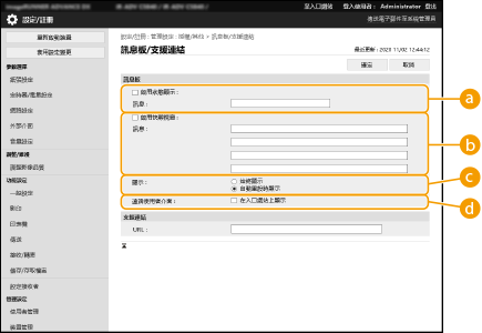 若要在觸控面板顯示螢幕的底部顯示訊息,請選擇核取方塊並且在 [訊息] 中輸入訊息。使用此設定以顯示操作提示以及其他低優先性訊息。