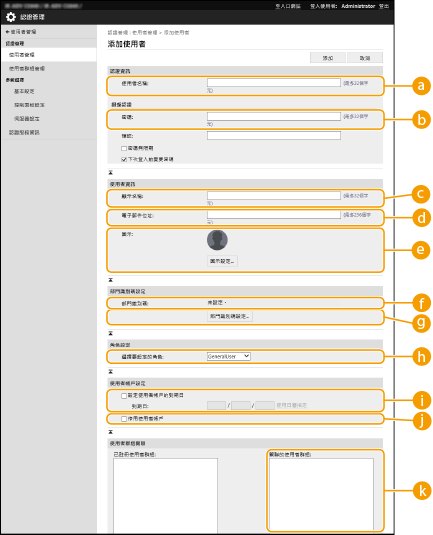 dc | 否 | 0 至 32 個字元 | 控制字元 | - (N/A) | 無法變更。為下列使用者自動指派。 按照伺服器認證註冊的使用者 透過圖片登入中的 <工作接收時自動註冊> 註冊的使用者 |