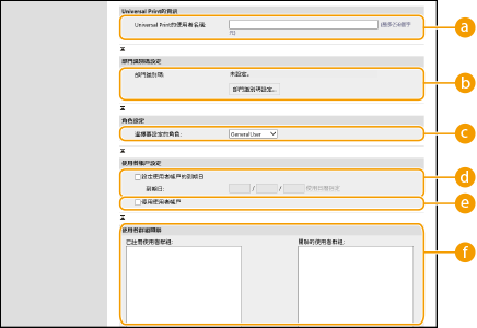 [部門識別碼:]使用部門 ID 管理時,必須按一下 [部門識別碼設定...],然後從清單中選擇部門 ID 以指定給使用者。首先,在清單畫面的 [註冊新部門...] 註冊需要的部門 ID。如果在此處指定的部門 ID 之後遭刪除,請確認變更此設定。