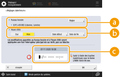 Pour définir l'heure d'été, appuyez sur <Oui> puis spécifiez la date et l'heure pour <Date début> et <Date de fin>. Pour définir la date, indiquez le jour de la semaine et la semaine du mois.