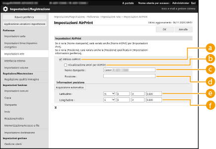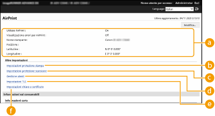 Se si accede con i privilegi di amministratore, è anche possibile modificare le impostazioni di AirPrint dalla pagina dedicata ad AirPrint.