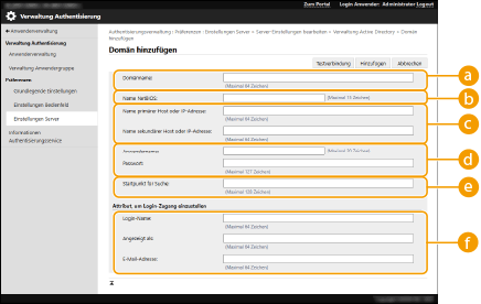 Geben Sie die Zeichenfolge ein, die am Attribut registriert wird und unter [Anwenderattribut zum Durchsuchen:] angegeben ist. Geben Sie den Gruppennamen ein, um die Rechte basierend auf der Gruppe festzulegen, zu der der Benutzer gehört.