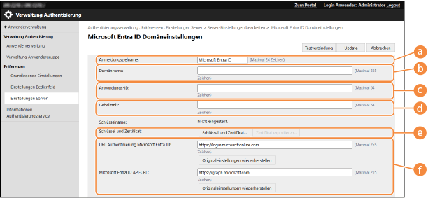 Um Active Directory/LDAP-Server/Microsoft Entra ID als ein zusätzliches Authentifizierungsgerät festzulegen, müssen Sie die Informationen des für die Authentifizierung verwendeten Servers registrieren. Führen Sie bei Bedarf einen Verbindungstest durch.