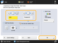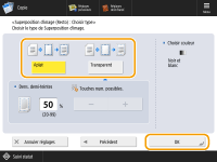 Pour superposer l'image de forme sans régler la densité, appuyez sur <Aplat>. Pour superposer l'image de forme avec une densité réduite, appuyez sur <Transparent> et réglez la densité.
