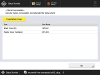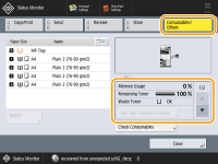 (Suivi statut/Annulation), l'écran de Suivi statut s'affiche, ce qui vous permet de vérifier le niveau du toner ou d'autres indications de statut.