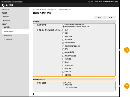 如果选择[选择需要认证的功能时显示登录屏幕],同样选择此功能来显示登录屏幕。