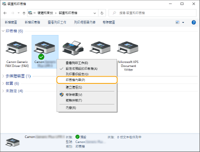 在印表機圖示上按一下滑鼠右鍵,然後按一下 [印表機內容]。