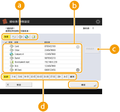 選擇(電子郵件)、(傳真)、(I-fax) 或(檔案)篩選通訊清單 () 中顯示的接收者。按 <全部> 顯示所有註冊的接收者。