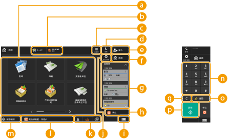 這些按鈕可讓您開啟基本功能畫面,例如「影印」和「掃描後傳送」。