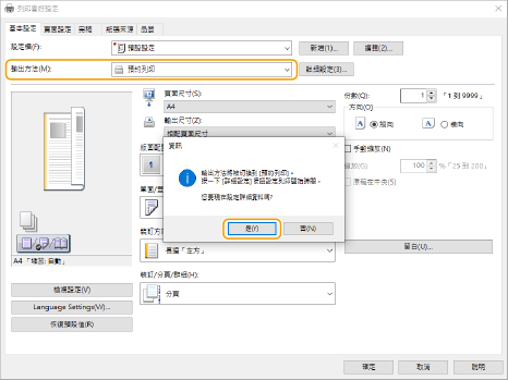 從 [輸出方法] 選擇 [預約列印],然後按一下 [是]。