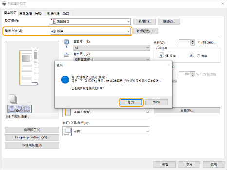 從 [輸出方法] 選擇 [儲存],然後按一下 [Yes]。