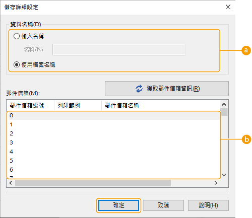 在本機上註冊的信箱名稱可於印表機驅動程式上使用。如需詳細資訊,請參閱印表機驅動程式的説明。