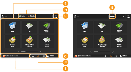 Podle režimu a stavu používání stroje se zleva doprava zobrazí následující tři typy tlačítek. Upozorňujeme, že zobrazená tlačítka se liší podle modelu a nainstalovaných doplňků.
