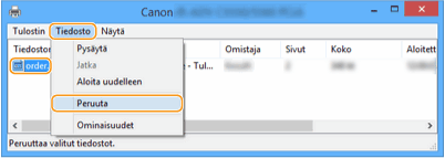 Jos et löydä peruutettavaa asiakirjaa, se on jo lähetetty laitteeseen. Tässä tapauksessa et voi peruuttaa tulostusta tietokoneesta.