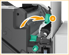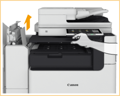 Jeśli papier jest zakleszczony, otwórz pokrywę modułu przekazywania bufora i delikatnie wyciągnij papier w kierunku wskazanym przez strzałkę.
