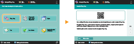Veja o guia de funções e a página de perguntas frequentesCarregue em <Iniciação/Perg. freq.> para apresentar um ecrã que indica o que pode fazer com as funções da máquina, bem como dicas que explicam como utilizar operações de cópia, leitura, etc. Consulte este ecrã quando quiser mais informações sobre as funções disponíveis e como utilizá-las. Também pode aceder à página de perguntas frequentes a partir de um dispositivo móvel.