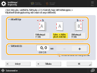 Justera sadelhäftningens falsningsposition och häftningsposition så att de är i mitten av pappret. Skriv ut en provsida – kontrollera det aktuella tillståndet på falsningspositionen och förskjutningsbredden på provsidan, och utför sedan justeringen.