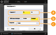 Dedikerad grupp är en förinställd grupp för programvaran Canon Device Management. Tryck på <Ange dedikerad grupp> för att använda denna dedikerade grupp. För att ange en generell grupp, tryck på <Ange gruppnamn 1> eller <Ange gruppnamn 2>. Se manualen för programvaran du använder för mer information.