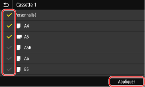 Les formats de papier dont les cases sont décochées ne sont pas affichés sur l'écran de paramétrage du papier.