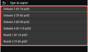 Lorsque du papier est chargé dans le bac polyvalent, l'écran suivant s'affiche sur le panneau de commande. Paramétrez le format et le type de papier en fonction du papier chargé.
