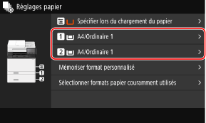 Sur le panneau de commande, appuyez sur [Réglages papier] dans l'écran [Accueil]. Écran [Accueil]