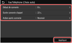 Sélectionnez la durée de la sonnerie et l'action à exécuter en réponse à la réception d'un fax, puis appuyez sur [Appliquer].