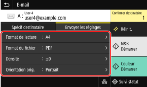 Lorsque vous faites une numérisation depuis l'appareil, vous pouvez utiliser l'onglet [Envoyer les réglages] dans l'écran de numérisation pour sélectionner le format de l'original et régler la qualité d'image.
