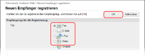 Bearbeiten oder Löschen von registrierten ZielenSie können die registrierten Informationen bearbeiten, indem Sie auf dem Bildschirm in Schritt 4 auf das zu bearbeitende Ziel klicken. Klicken Sie in Schritt 4 auf [Löschen] rechts neben dem Ziel, das Sie löschen möchten, und das Ziel wird gelöscht. Wenn das Ziel im Adressbuch mit "Favoriteneinstellungen" angegeben ist, wird der Bearbeitungs- oder Löschvorgang auch auf "Favoriteneinstellungen" angewendet. Registrieren und Abrufen von Favoriteneinstellungen |