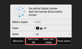 Wenn ein Original auf das Vorlagenglas gelegt und mithilfe 2-seitigem Kopieren oder N auf 1 kopiert wird, erscheint der Bildschirm zum Scannen des nächsten Originals.