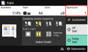 Drücken Sie [Kopienanzahl], geben Sie mit den Zahlentasten die Anzahl der Kopien ein, und drücken Sie dann [Schließen].