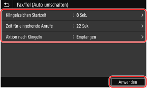 Stellen Sie dies ein, wenn [Fax/Tel (Auto umschalten)] als Empfangsmodus ausgewählt ist. Wenn Sie einen anderen Empfangsmodus gewählt haben, ist dieser Schritt nicht erforderlich.