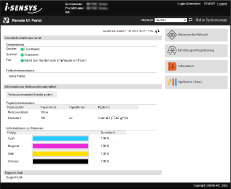 Wenn Sie sich bei Remote UI anmelden, wird die Portalseite (Hauptseite von Remote UI) angezeigt. Von hier aus können Sie den Betriebsstatus des Geräts überprüfen, verschiedene Informationen anzeigen und die Einstellungen per Schaltflächenbetätigung ändern.