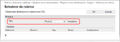 In [Tipo], selezionare [Preferiti] o [Selezione codificata] e fare clic su [Visualizza] per modificare la visualizzazione della Rubrica.
