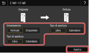 Impostare l’orientamento, il tipo di apertura dell’originale e il tipo di apertura della copia, in base alle proprie esigenze.