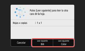 Puede copiar el reverso con un modo de color diferente (blanco y negro o color) del que ha usado con el anverso. Para copiar el reverso en blanco y negro, pulse [Leer siguiente B/N]. Para copiar en color, pulse [Leer siguiente Color].