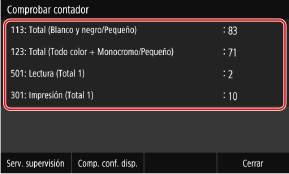 Operaciones disponibles en la pantalla para comprobar el contadorLos elementos que aparecen en pantalla varían en función de su país o región. Pulse [Serv. supervisión] para comprobar la conexión al servidor de supervisión. Lleve a cabo esta operación para enviar la información del equipo al servidor de supervisión de forma periódica. Pulse [Comp. conf. disp.] para comprobar la configuración de las opciones en el equipo.
