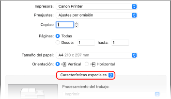 2 | En el menú emergente de opciones de impresión, seleccione [Características especiales]. Si no aparecen las opciones de impresión, haga clic en [Mostrar detalles] en el cuadro de diálogo de impresión. |