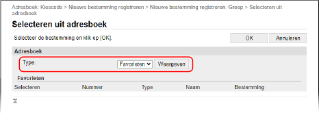 In [Type] selecteert u [Favorieten] of [Kiescode] en klikt u op [Weergeven] om een ander scherm van het adresboek te kiezen.