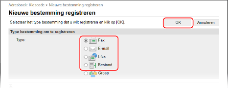 Geregistreerde bestemmingen bewerken of verwijderenU kunt de geregistreerde informatie bewerken door op de bestemming te klikken die u wilt bewerken in het scherm in stap 4. In stap 4 klikt u op [Verwijderen] rechts naast de bestemming die u wilt verwijderen, waarop deze wordt verwijderd. Als de bestemming in het adresboek wordt opgegeven met ’Favoriete Instellingen’, wordt de bewerk- of verwijderactie ook toegepast op ‘Favoriete Instellingen’. Favoriete instellingen registreren en oproepen |