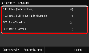 U kunt een teller weergeven die het tot op heden totaalaantal gekopieerde en afgedrukte pagina's weergeeft op zwart-wit en kleur.