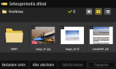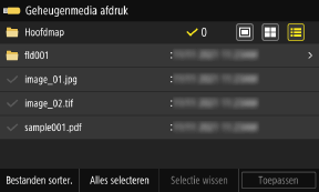 U kunt alle weergegeven bestanden selecteren met behulp van [Alles selecteren] onderaan het scherm. Als er zowel PDF bestanden als beeldbestanden (JPEG of TIFF bestanden) zijn, verschijnt er een scherm waar u het bestandstype selecteert. Kies nu het bestandstype dat u wilt afdrukken.
