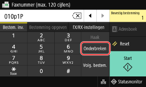 Als u een fax naar een internationale bestemming verzendt, voer dan in de juiste volgorde het internationale toegangsnummer, de landcode, en het faxnummer in. Druk op [Onderbreken] om tussen de nummers een pauze toe te voegen.