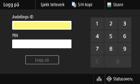 Når Administrere avdelings-ID er satt opp, vises følgende skjermbilde for innlogging. Skriv inn avdelings-ID når du vil logge inn. Hvis det er angitt en PIN-kode, skriver du inn denne.