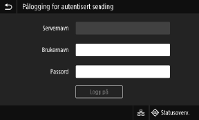 Når godkjent sending (LDAP-servergodkjenning) er satt opp, vises skjermbildet innlogging for godkjent sending når du skanner og sender faks. Skriv inn brukernavnet og passordet som håndteres med LDAP-serveren når du vil logge inn.