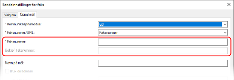 Skriv inn et faksnummer på fanen [Oppgi mål]. Når [Bekreft faksnummer] kan angis, skriver du inn det samme faksnummeret.