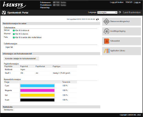 Når du logger inn på Fjernkontroll, vises portalsiden (fremsiden for Fjernkontroll). Herfra kan du sjekke brukstatus for maskinen, vise ulik informasjon og endre innstillingene ved bruk av knapper.