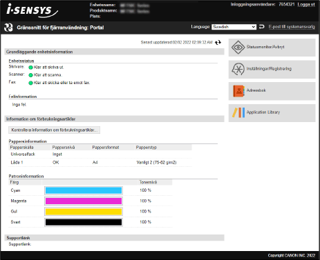 När du loggar in på fjärranvändargränssnittet visas portalsidan (startsidan i fjärranvändargränssnittet). Härifrån kan du kontrollera enhetens åtgärdsstatus, se olika typer av information och ändra inställningar för knappfunktionerna.