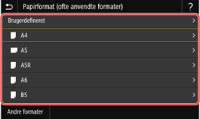 Tryk på [Andre formater], og vælg papirstørrelsen fra den viste liste.