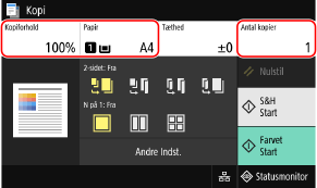 Indstil kopiforhold, papir og kopiantal.